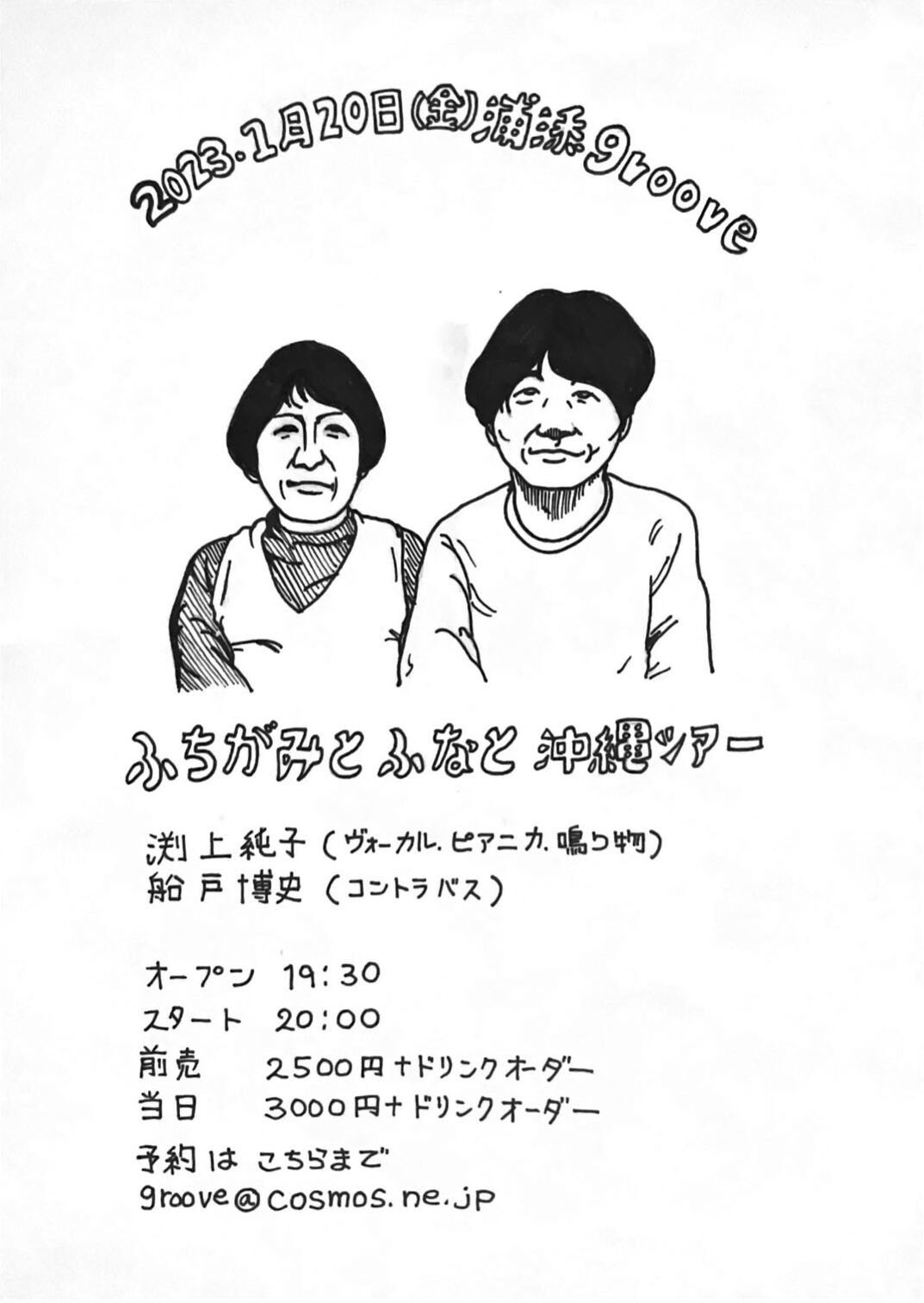 渊上和船户分别在非洲旅行时相识,回到日本后在京都再次相识,并于1991年开始唱歌,当时他们被要求在京都的熟人酒吧唱歌。只有木贝斯和歌曲的编曲以及选择和编曲歌曲的乐趣变得很流行,他们开始在各地的酒吧和派对上进行现场表演。此外,在这种情况下,我们自己重申了该组织表演的乐趣,于1992年创作了原创歌曲,并开始在现场演出,乐队名为 “Fuchigami and Funato”。1997 年,他创立了自己的品牌 “吉田屋标”。Fuchigami 和 Funato 的所有 5 张专辑将从这里发行。不为人知的音乐及其精神已逐渐被观众和表演者所接受,它们在活动地点、观众和主演等方面都呈现出扩张的同时,又走到了现在。