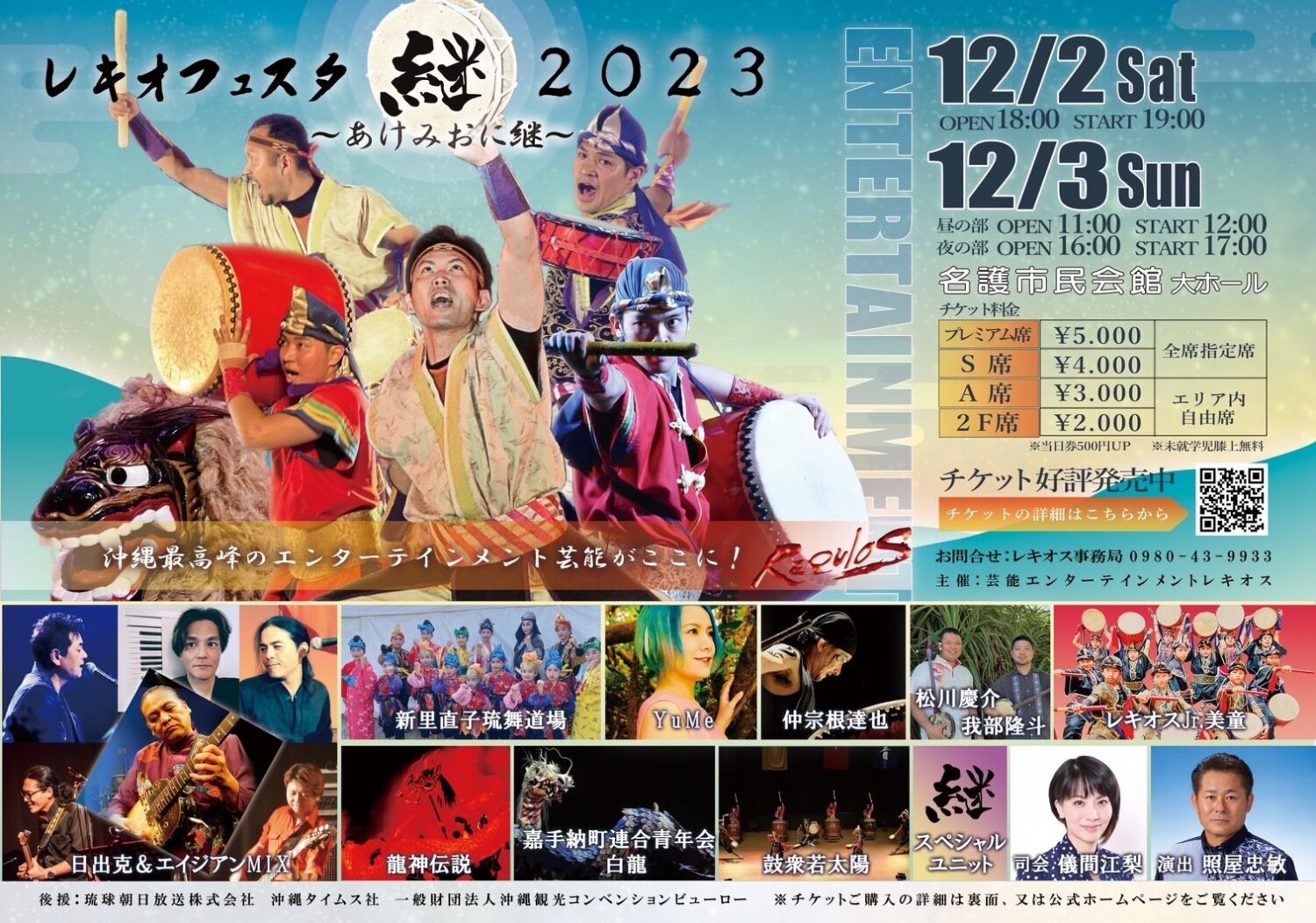 表演者:创意表演艺术 Rekios/Hinode Katsu & Asian Mix/新里直子龙游道场/Yume/Nakasone Tatsuya/松川启介和Kabe Ryuto/Rekios JR Bido/Ryujin Densetsu/嘉手纳镇联盟青年会 Hakuryou/Koushu Wakayotai/Sugu 特别单位/ Gima Eri(主持人)/Teruya Tadatoshi(导演)