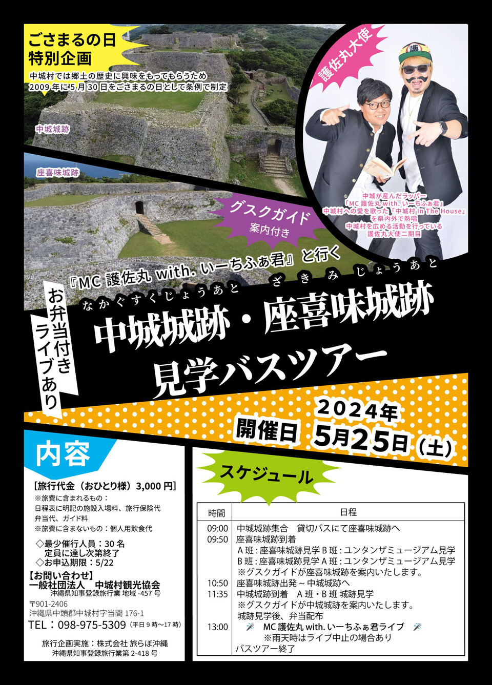 Gusuku导游将引导您游览中城堡遗迹和扎基米城堡遗址。游览结束后,您可以享受午餐(便当)和中城的说唱歌手组合 “MC Gosamaru with Ichifa-kun” 的现场表演。