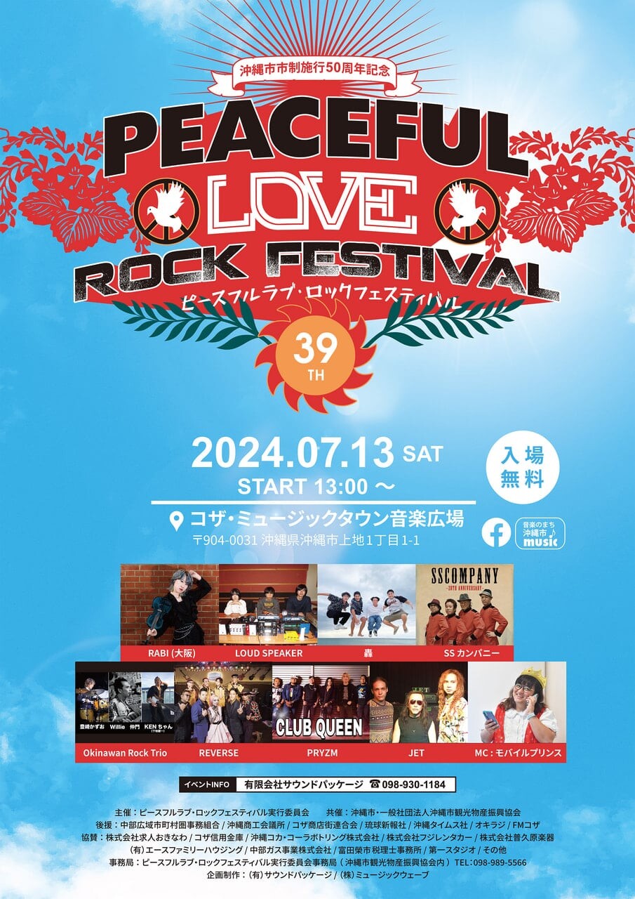 Peaceful Love Rock Festival倡导 “爱与和平”,并已发展成为冲绳的夏季传统,是日本众多夏季音乐节中的一项历史性摇滚盛会。2017 年,场地迁至冲绳市中心 Koza Music Town Town Town,新的 “城镇音乐节” 开始了。在充分利用Koza作为历史性活动的色彩的同时,我们将挑战 “城镇节日” 所独有的新吸引力,这种吸引力可以代代相传。