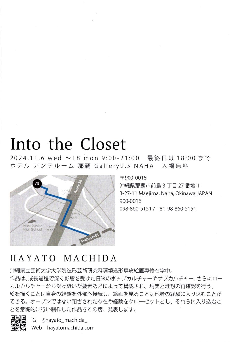 HAYATO MACHIDA在冲绳的首次个展,他在进入冲绳县立艺术大学研究生院后,一直在研究主题为 “研究具有少数民族特性的扁平表情” 下从事创作活动。以新作品为重点,还将展出过去未出版的作品。