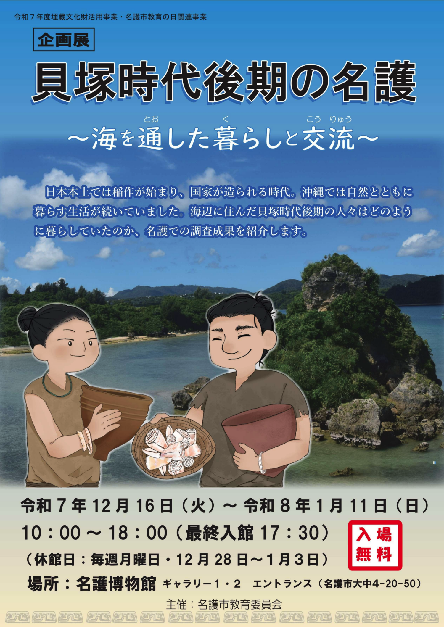 那时日本本土开始种植水稻并形成了一个国家。在冲绳,人们继续与大自然共处。我们将在名护介绍关于贝冢时代后半期生活在海边的人们的生活情况的调查结果。