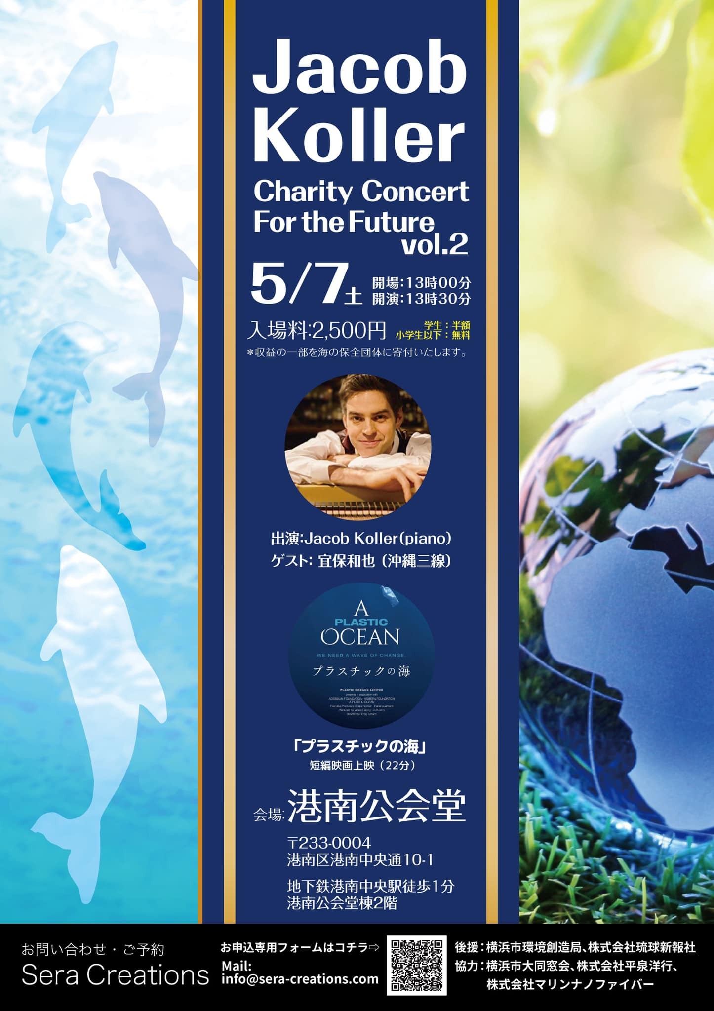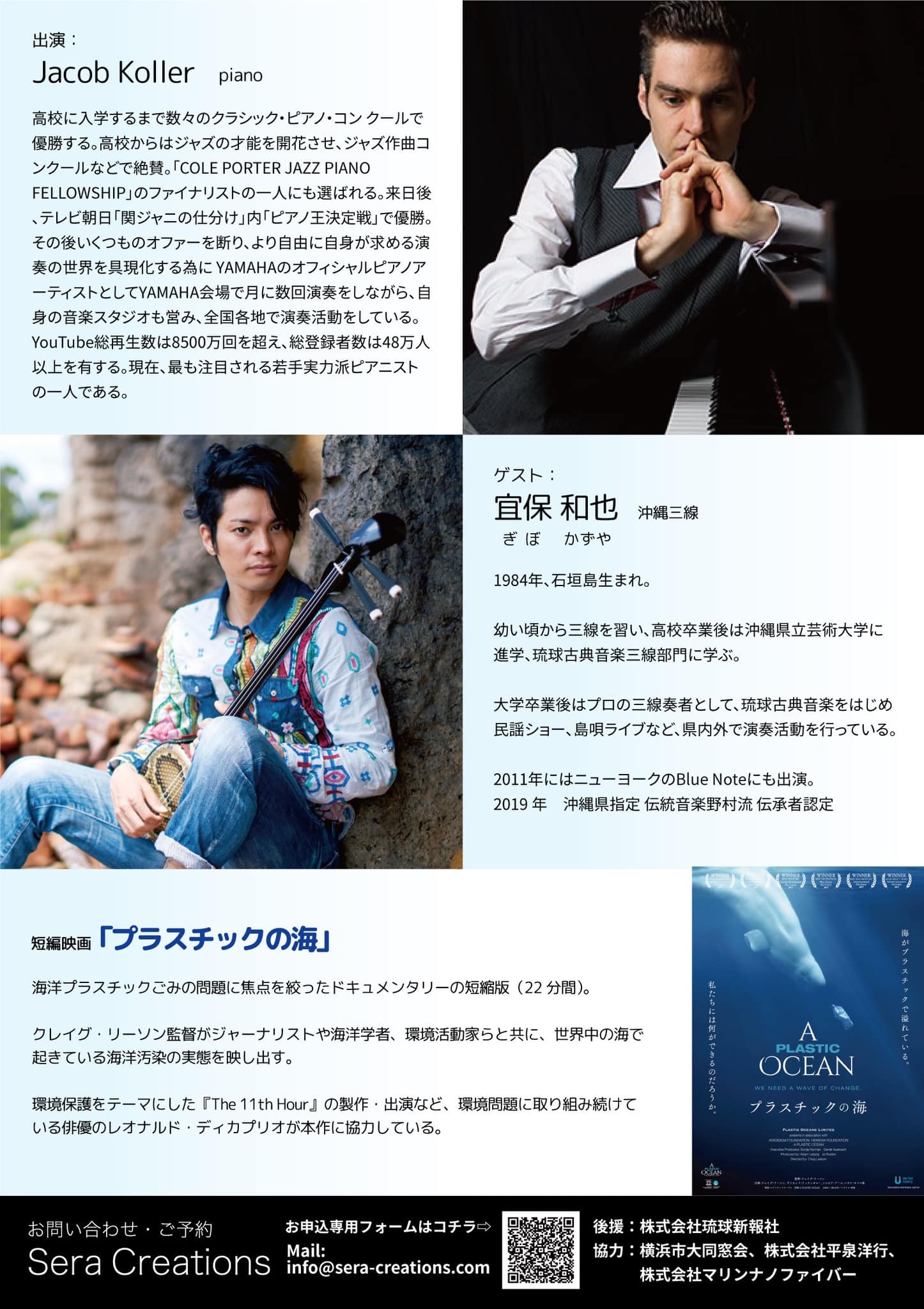 アメリカ生まれのジャズピアニストで、現在は日本を拠点に活動するジェイコブ・コーラーが、三線唄者の宜保和也をゲストに招いて開催するチャリティーコンサート。
