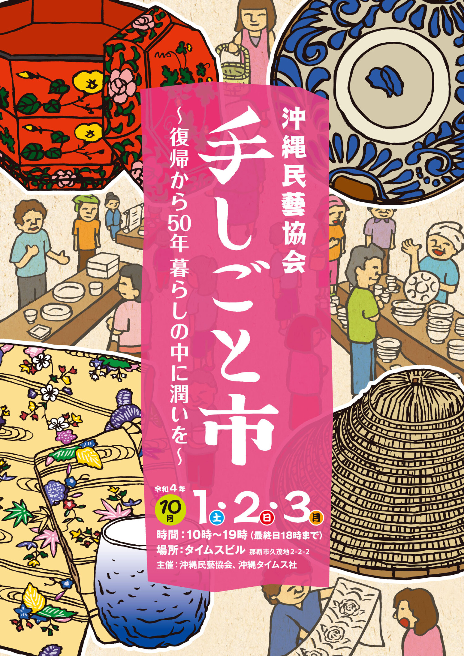 復帰50年を記念した沖縄民藝協会による手しごと市。戦後・復帰後の沖縄における民藝活動を紹介し、芭蕉布、首里織、陶器、ガラス、小禄クンジー、紅型、漆器、民具、木工、写真などさまざまなジャンルの作品を展示販売する。