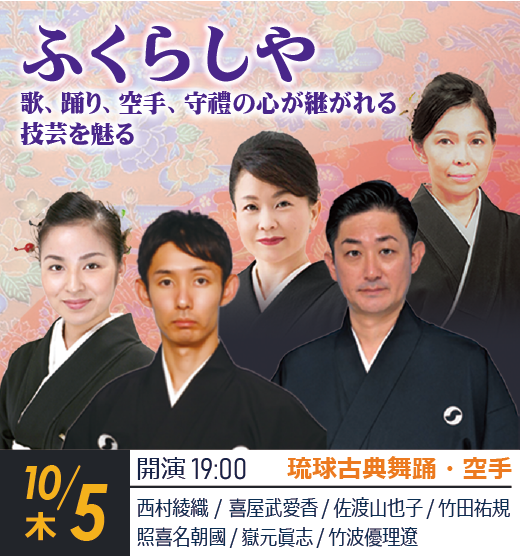 出演:喜屋武愛香(琉球舞踊真境名本流 英美の会師範)/佐渡山也子(琉球舞踊島袋流 千尋会師範)/西村綾織(琉球舞踊玉城流 喜納喜利の会師範)/照喜名朝國(琉球古典音楽安冨祖流 絃聲会師範・琉球古典音楽安冨祖流音楽研究朝一会)/竹田祐規(琉球古典音楽安冨祖流 絃聲会師範)/嶽元眞志(上地流空手道 琉球古武道琉志会 安謝修武館)/竹波優理遼(上地流空手道 琉球古武道琉志会 安謝修武館)