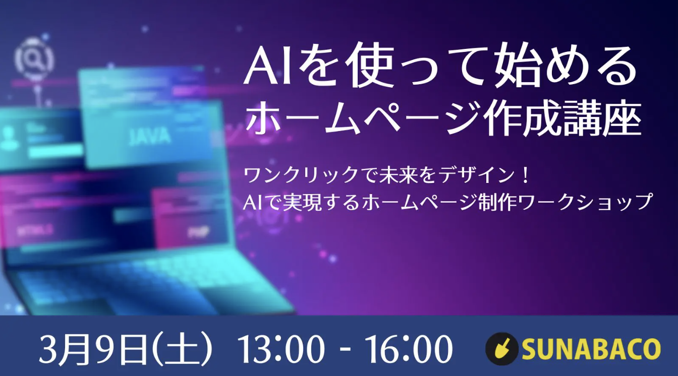 ホームページ制作に興味がある、副業にチャレンジしたい、AIをよく知りたい人向けの講座。AI を利用してホームページ作成を行う。従来のやり方とどうちがうのか体験できる。¥