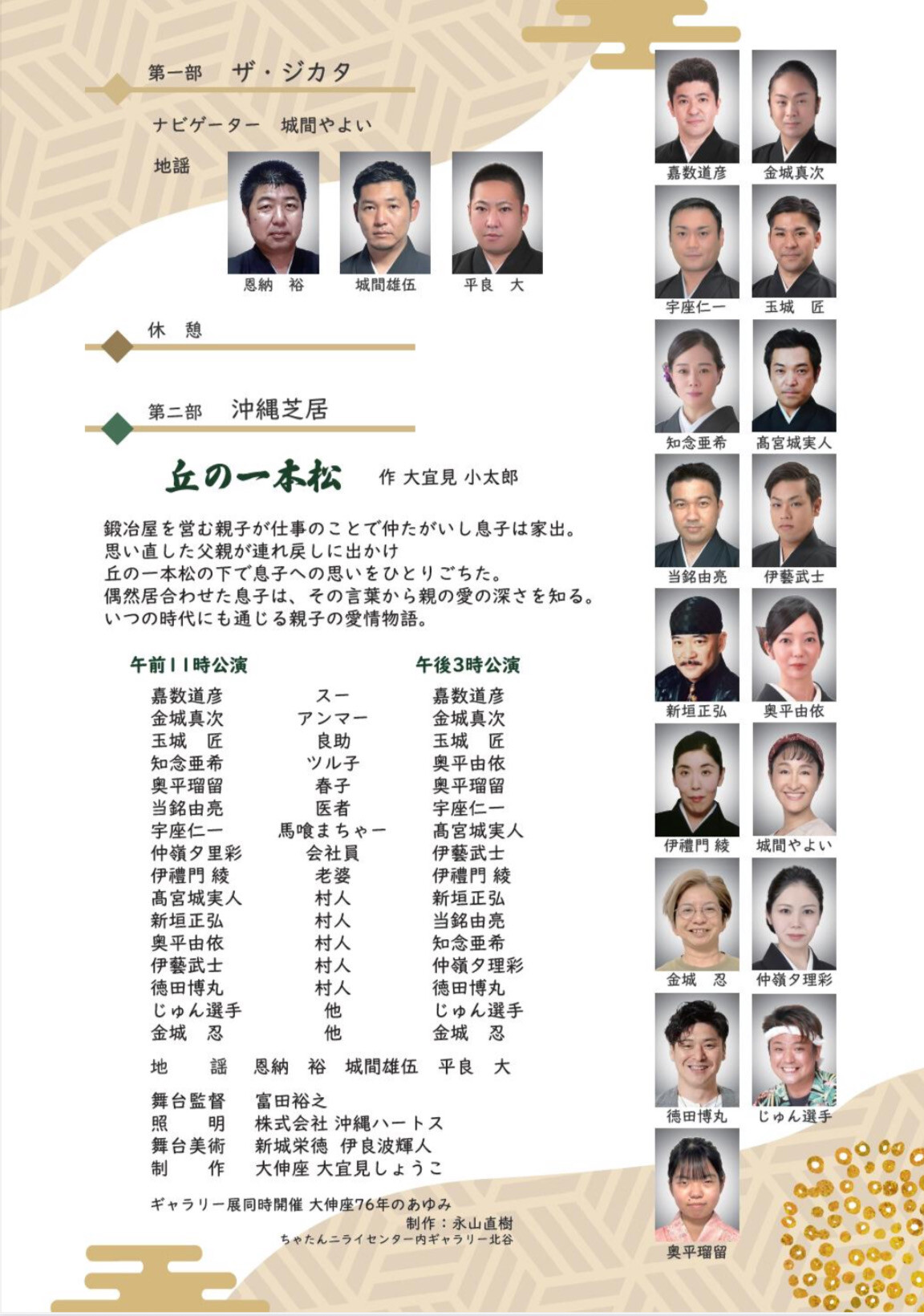 11:00 公演:嘉数道彦(スー)/金城真次(アンマー)/玉城匠(良助)/知念亜希(ツル子)/奥平瑠留(春子)/当銘由亮(医者)/宇座仁一(馬喰まちゃー)/仲嶺夕里彩(会社員)/伊禮門綾(老婆)/高宮城実人(村人)/新垣正弘(村人)/奥平由依(村人)/伊藝武士(村人)/徳田博丸(村人)/じゅん選手(他)/金城忍(他)