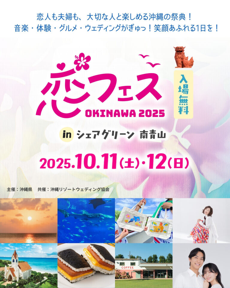 カップルで沖縄を体感できるフード&ドリンク、アーティストライブ&トークショー、紅型やアクセサリー作り体験等が楽しめるほか、沖縄への旅行やリゾートウェディングの相談もできる(来場予約でプチギフトプレゼント、商談ブース訪問でリゾートホテル宿泊券等が当たる抽選会に参加可)。