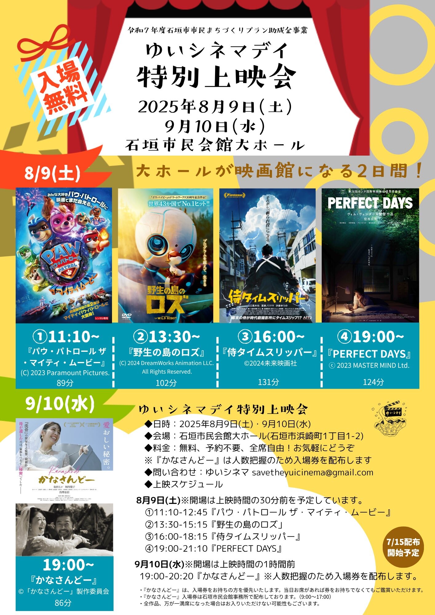 “Yui Cinema,” which has continued screenings with the desire to deliver movies to Yaeyama and rebuild movie theaters on Ishigaki Island, will hold free screenings at the Ishigaki Civic Hall Large Hall this summer under the title “Yui Cinema Day Special Screening.”