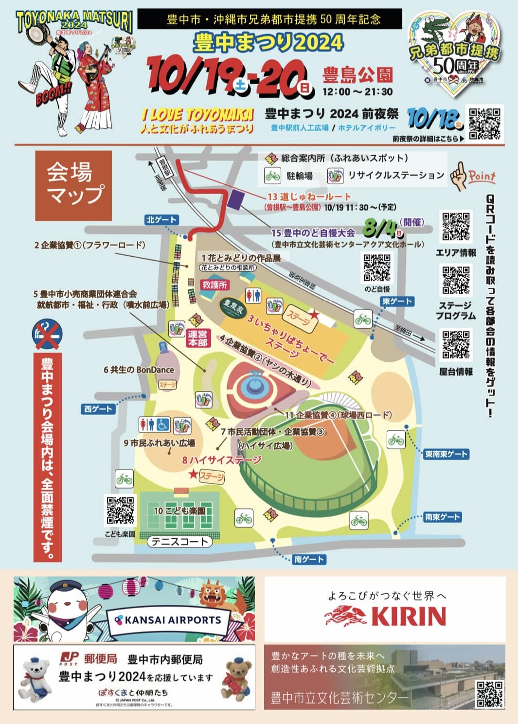 2024 年是沖繩市與豐中市之間的兄弟城市夥伴關係的 50 周年,到目前為止已經進行了各種公民交流和行政交流。豐中祭是在「鐵島公園(鐵島公園)」等地著名的當地活動。在主舞台上舉行的「沖繩聲音舞台」將演出現場音樂、沖繩 Eisa、舞蹈表演等。