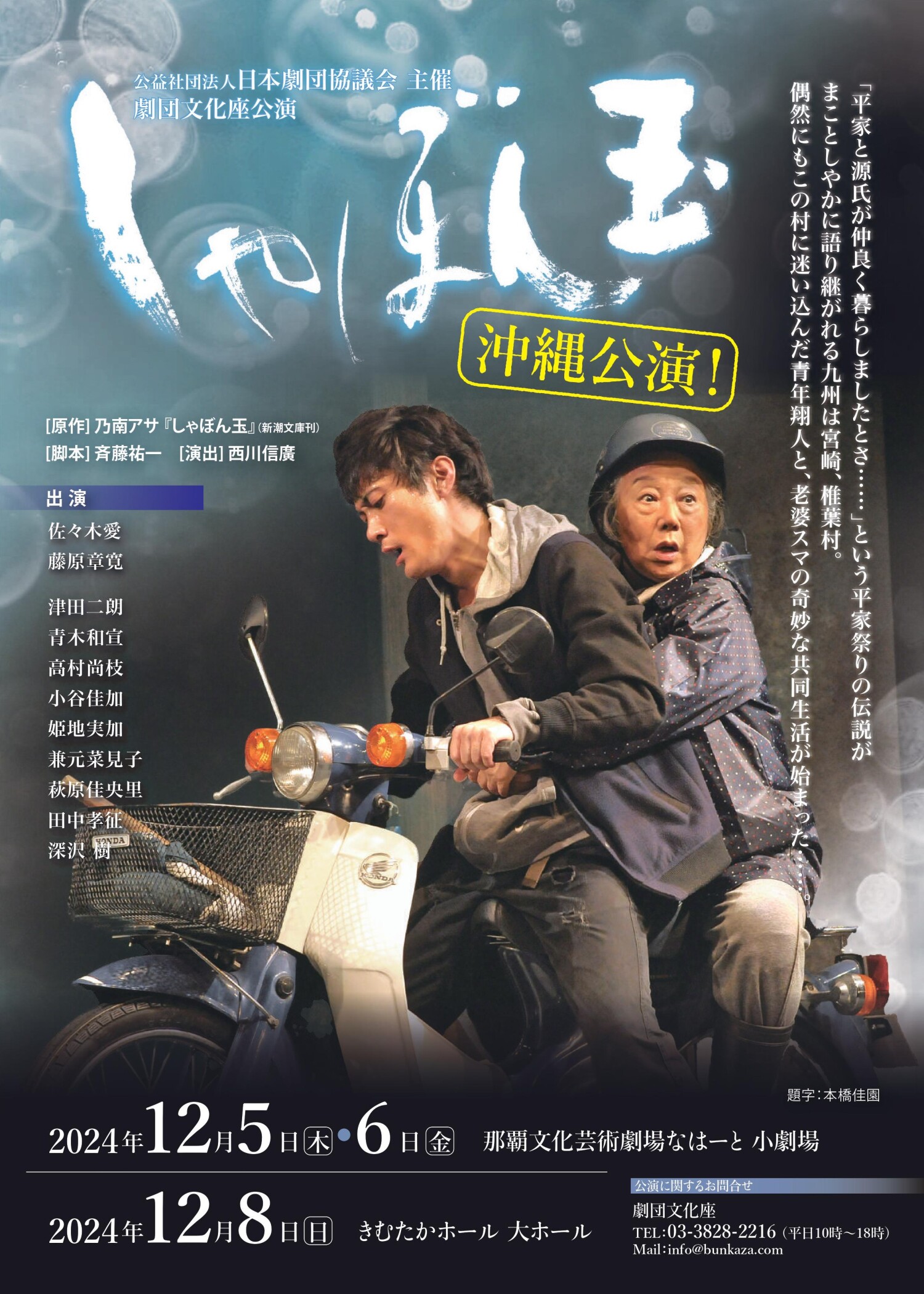 劇院公司 Bunka Za 由佐崎愛領導,他在她回來之前拍攝的傳奇電影「沖繩」中出演。我 2 年前參觀的「生命與寶藏」的沖繩表演描繪了千永龜郎和阿瓦根正子之間的不懈戰鬥。這一次,野波麻的原創故事將在舞台上放置。一個感動人的故事,當他遇到一位老婦的時候,一個不受父母的愛祝福,並且經常因絕望而多次犯罪,在遇到一位老婦時恢復自己,成為觸發器。