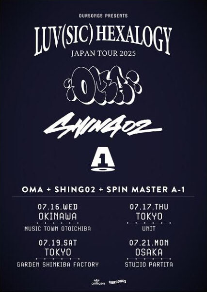 「LUV(SIC)六學日本之旅」將在東京、大阪和沖繩 3 個城市進行。由 Shing02 和 Nujabes 創作的「LUV(SIC)」系列超越著名歌曲的界限,深刻在世界的耳朵和心中。在這次巡演中,Shing02、SPINMASTER A-1 和總部位於曼徹斯特的嘻哈樂隊 OMA 將以六部分的系列為中心,他們期待已久的回歸日本。