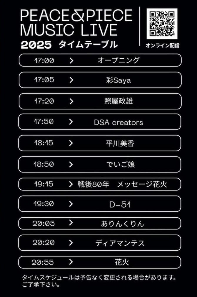 這場音樂會自 2015 年開始舉行,旨在廣泛傳播和分享讀谷村的和平祝願,以達到沖繩和平的目標。它將在預定於 10 月 25 日 26 日舉行的讀谷節前夕作為一種類似節日的活動舉行。